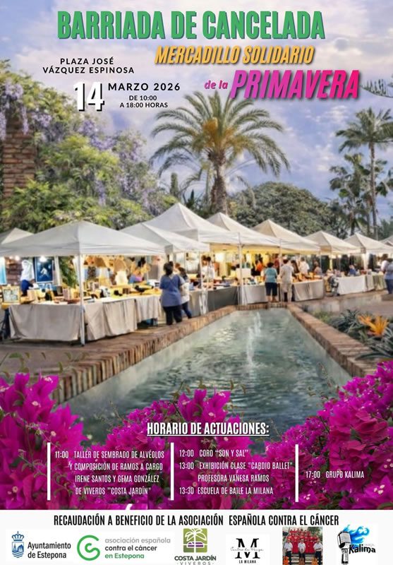 La plaza José Vázquez Espinosa de la barriada de Cancelada acogerá el próximo sábado 14 de marzo el Mercadillo Solidario de Primavera, organizado por el Ayuntamiento de Estepona a beneficio de la Asociación Española contra el Cáncer. El evento se extenderá de 10:00 a 20:00 horas y contará con más de treinta puestos de productos artesanales, entre ellos bisutería, bolsos, ropa infantil y artículos elaborados a mano.