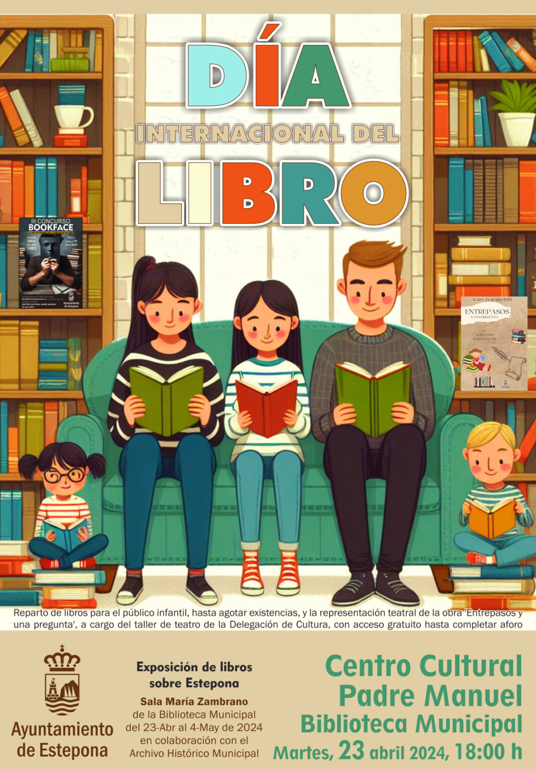 En cuanto al martes 23, Día Internacional del Libro, a las 18:00 horas, en el Centro Cultural Padre Manuel, se realizará el reparto de libros para el público infantil, hasta agotar existencias, y se representará la obra teatral ‘Entrepasos y una pregunta’, a cargo del taller de teatro de la Delegación de Cultura, con acceso gratuito hasta completar aforo.