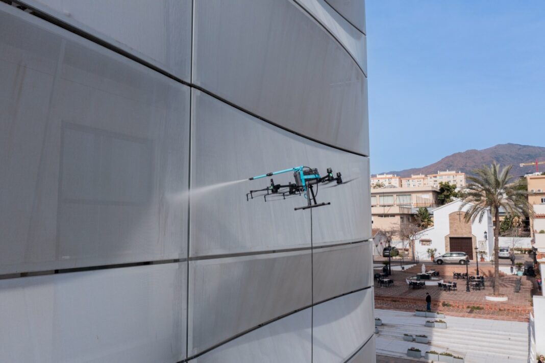 El Ayuntamiento de Estepona ha comenzado a utilizar un sistema pionero que emplea drones para la limpieza de fachadas de edificios públicos. En el día de hoy se ha comenzado a trabajar en el edificio del Mirador del Carmen, uno de los más emblemáticos del municipio, que cuenta con ocho plantas y que alberga espacios tan singulares como una biblioteca vertical, una sala expositiva, el conservatorio de música y un auditorio.