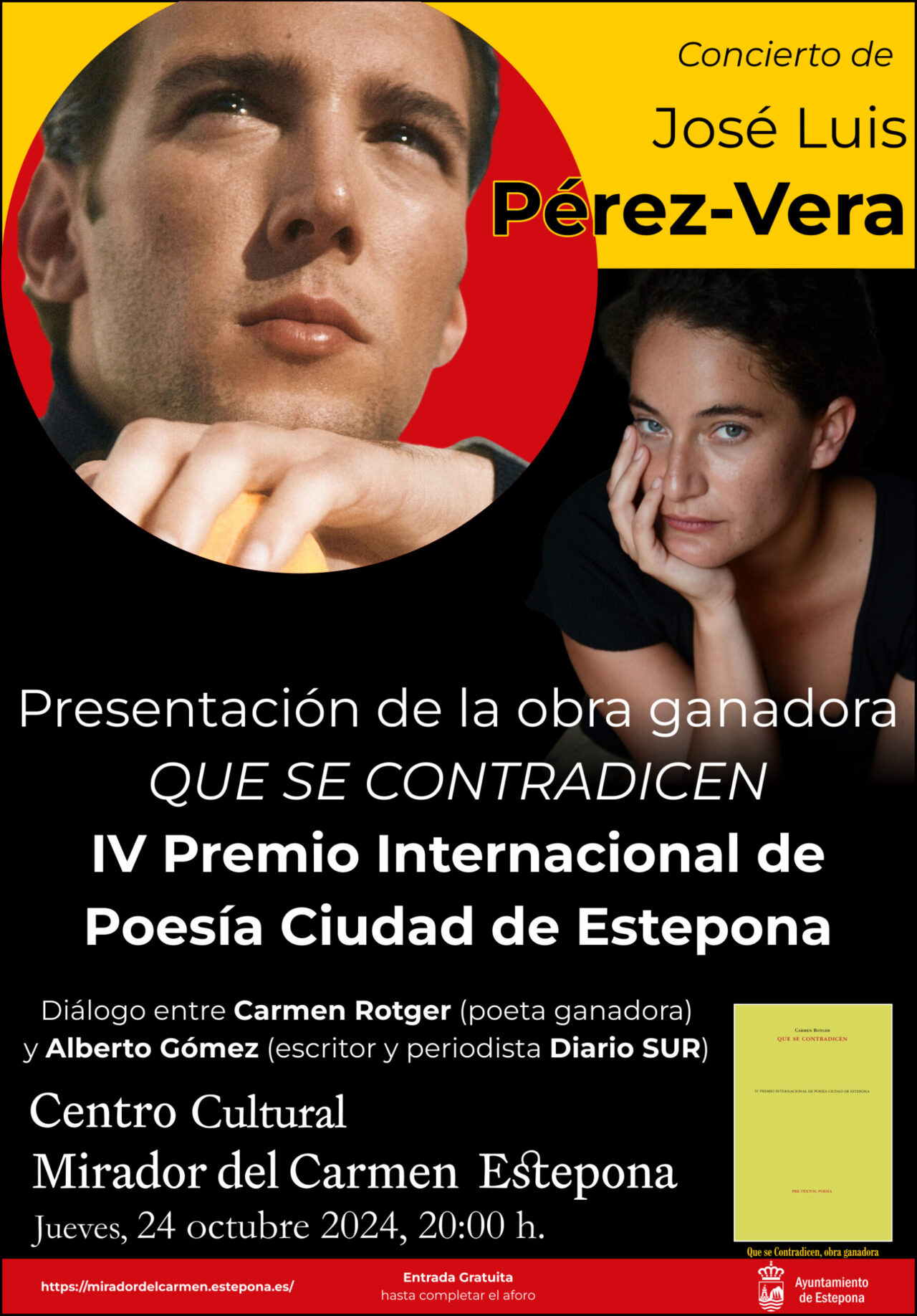 La poeta Carmen Rotger, autora de la obra ganadora, dialogará con el escritor y periodista del Diario SUR Alberto Gómez. Tras esta conversación vendrá el recital de José Luis Pérez-Vera (Sevilla, 1994). Con una herencia de antepasados flamencos, sus inicios en el mundo de la música arrancan en el seno familiar de la mano de su padre, Juan Rafael. Otra influencia importante en su vida artística es su tío Feliciano, compositor de innumerables sevillanas muy populares que han interpretado artistas como Marismeños o García Montes, siendo este hecho otro componente que marca la dualidad de este artista entre el mundo del flamenco’ jondo’ y el mundo de las sevillanas.