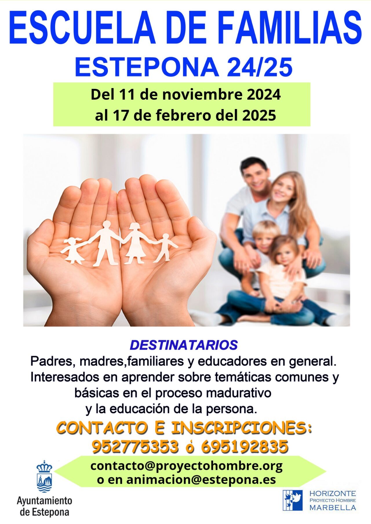 El Ayuntamiento de Estepona y la asociación Horizonte-Proyecto Hombre iniciarán el próximo mes de noviembre la decimocuarta edición de la actividad ‘Escuela de Familias’, una iniciativa coordinada por la delegación municipal de Juventud dirigida a padres, madres, familiares y educadores interesados en abordar temas comunes en el proceso de maduración y educación de los jóvenes.