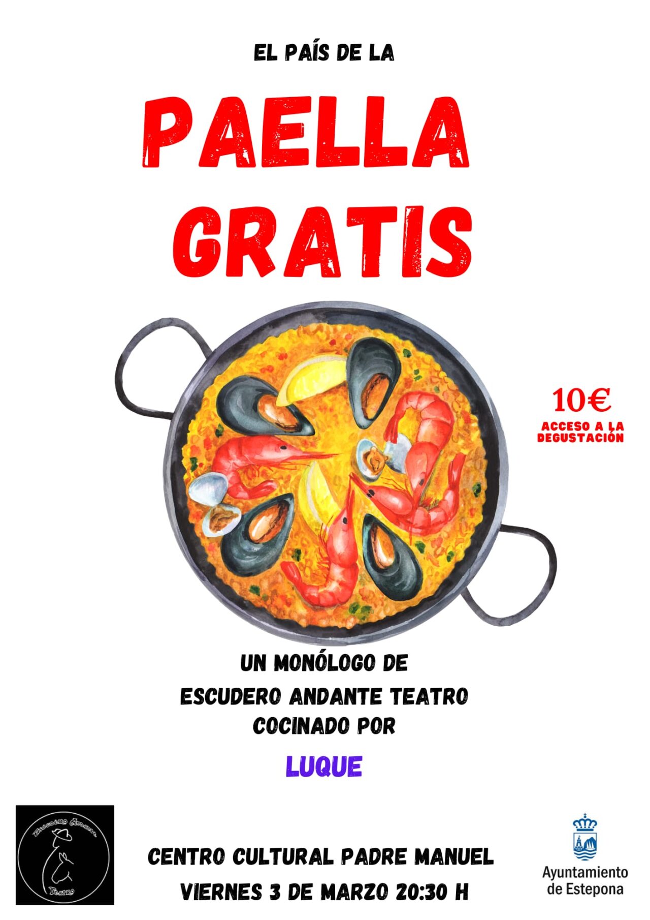 El Centro Cultural Padre Manuel acogerá el próximo viernes, 3 de marzo, a las 20:30 horas, la comedia ‘El país de la paella gratis’, un monólogo de la compañía Escudero Andante Teatro “cocinado” por Jesús Luque.