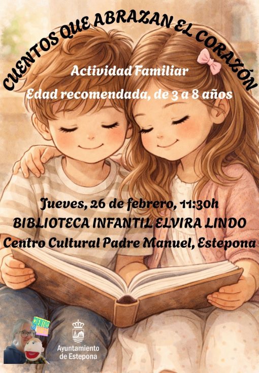 El Ayuntamiento de Estepona ha anunciado el 20 de febrero de 2026 que la Sala Infantil ‘Elvira Lindo’ de la Biblioteca Municipal, ubicada en el Centro Cultural Padre Manuel, acogerá el jueves 26 de febrero a las 11:30 horas el cuentacuentos familiar ‘Cuentos que abrazan el corazón’. La actividad, a cargo de Vanessa López Morales, está recomendada para público infantil de entre 3 y 8 años. El acceso será libre y gratuito hasta completar aforo.