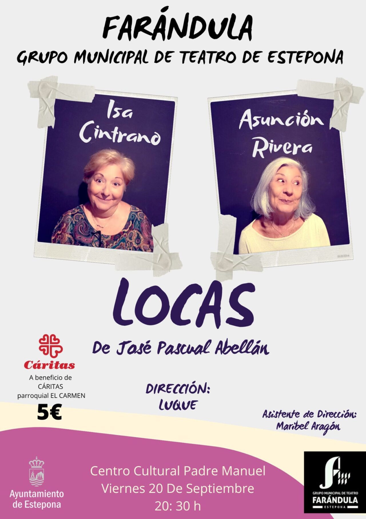 El Grupo Municipal de Teatro ‘Farándula’ representará el próximo viernes 20 de septiembre la comedia ‘Locas’, de José Pascual Abellán, a beneficio de Cáritas de la Parroquia Nuestra Señora del Carmen. Será en el Centro Cultural Padre Manuel a las 20.30 horas.