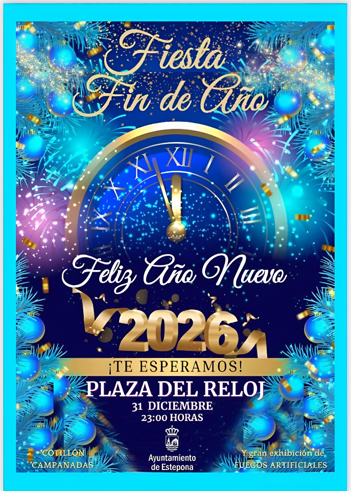 Estepona ha programado una fiesta de Fin de Año en la Plaza del Reloj para el 31 de diciembre a partir de las 23.00 horas. El Ayuntamiento de Estepona despedirá el 2025 con un evento que incluye actuación de la Orquesta Q Gain, entrega de cotillón, campanadas y fuegos artificiales.