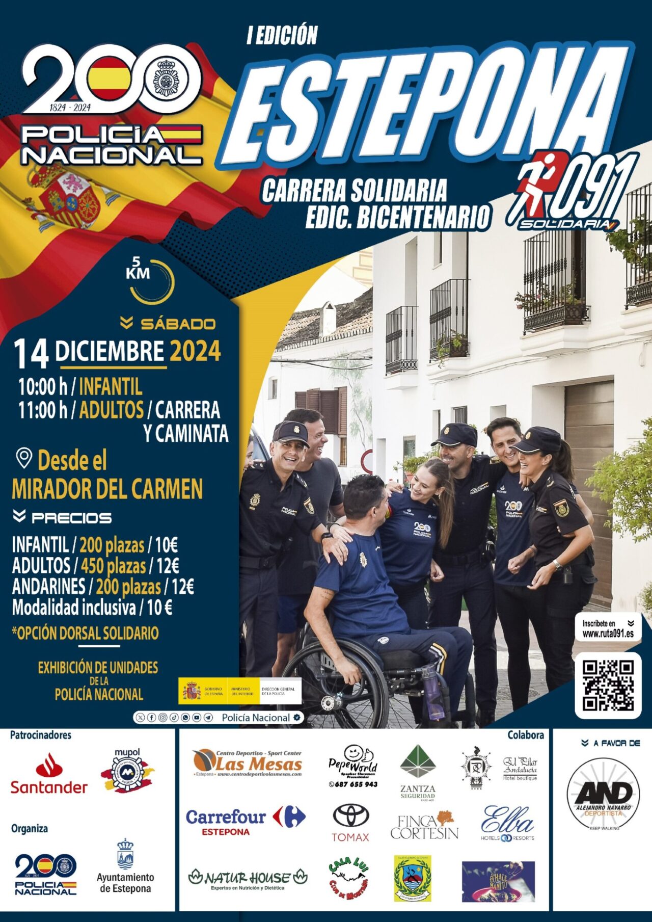El alcalde de Estepona, José María García Urbano, el Comisario, responsable de la Comisaría Local de Estepona, Santos Lázaro Martín, el director de Zona de la Costa del Sol del Banco Santander, Juan Manuel Ballesteros, el director del Centro Deportivo Las Mesas, Javier Rodríguez, y el deportista Alejandro Navarro han presentado hoy la I Carrera Solidaria ‘Ruta 091’, Edición Bicentenario, que recaudará fondos para la Asociación ‘Alejandro Navarro Deportista’.