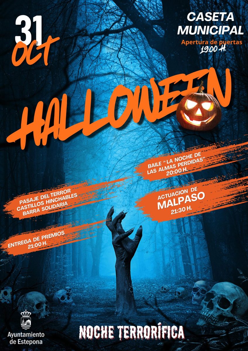 La Caseta Municipal del Recinto Ferial de Estepona acogerá el 31 de octubre una celebración de Halloween de 19:00 a 00:00 horas que distribuirá 3.500 euros en premios para los mejores disfraces en dos categorías. El evento incluye actuaciones, castillos hinchables, un Pasaje del Terror y concursos sin inscripción previa con entregas de galardones a las 21:00 horas. El grupo local Malpaso ofrecerá un concierto a las 21:30 horas tras la actuación de baile La noche de las almas perdidas programada a las 20:00 horas. La barriada de Cancelada celebrará simultáneamente su propia fiesta en la Plaza de la Juventud desde las 17:00 hasta las 23:00 horas.