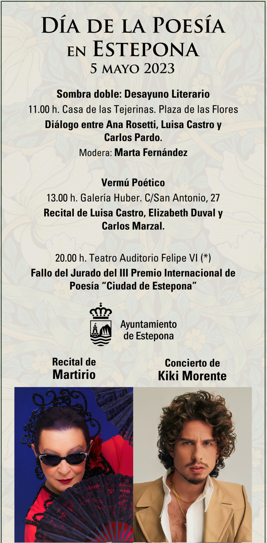 el próximo 5 de mayo se celebrará una gala en el Auditorio Felipe VI para dar a conocer el fallo del jurado del III Premio Internacional de Poesía ‘Ciudad de Estepona’. El evento, que dará comienzo a partir de las 20.00 horas, contará con un recital de la cantante Martirio y un concierto del cantante Kiki Morente. Las invitaciones para asistir a la gala podrán recogerse a partir de este jueves, 20 de abril, en el Centro Cultural Padre Manuel.