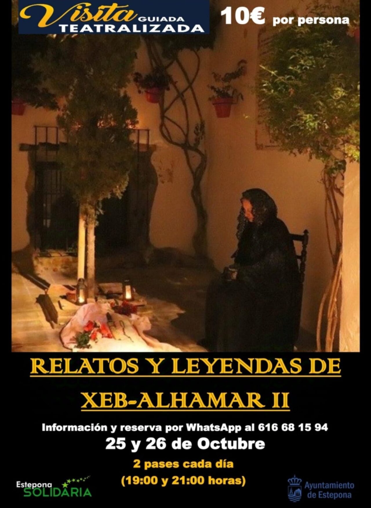 ‘Estepona Solidaria’ dará la oportunidad de vivir en primera persona nuevos episodios de estos ‘Relatos y Leyendas de Xeb -Alhamar’ con las visitas guiadas teatralizadas que tendrán lugar el viernes 25 y sábado 26 de octubre, con dos pases diarios: a las 19.00 y 21.00 horas. El inicio y final será en la Plaza de las Flores. Serán representaciones totalmente distintas a las anteriores, con leyendas e historias diferentes a las ya representadas, y con un nuevo itinerario.